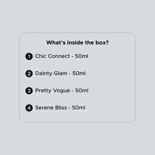 📦 Box Contents: 4 x Luxury 50ml Body Mists ⭐ Key Features: ✔️Floral & Fruity Fragrance Family ✔️Moderate Sillage & Long-Lasting ✔️Vegan Formulation 🍃 ✔️Shelf Life: 36 Months ✔️Made in UAE